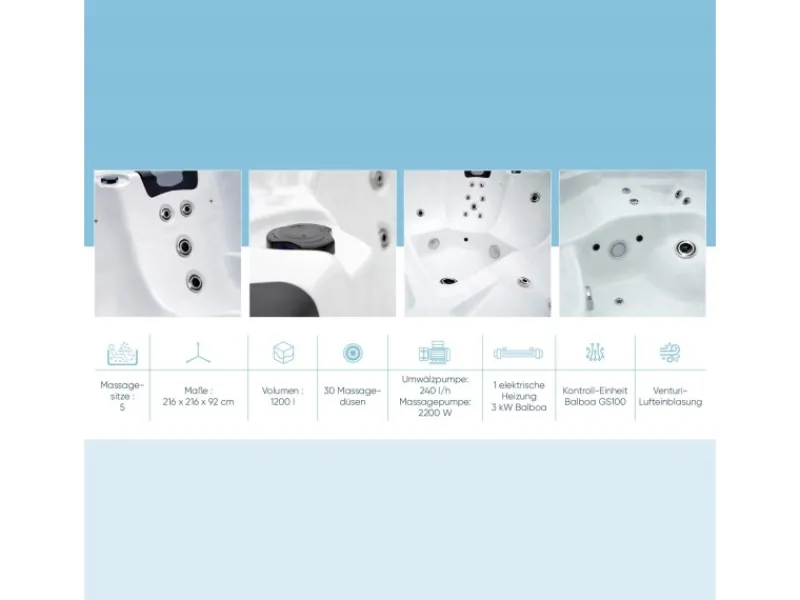 Mit der intuitiven Steuerung von Balboa erhältst du Zugang zu allen Funktionen deines Whirlpools, einschließlich Massage, Farbauswahl und Temperaturregelung. Diese ermöglichen eine individuelle Anpassung deines Wellness-Erlebnisses, was dir eine optimale Entspannung bietet.