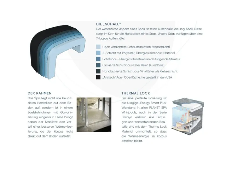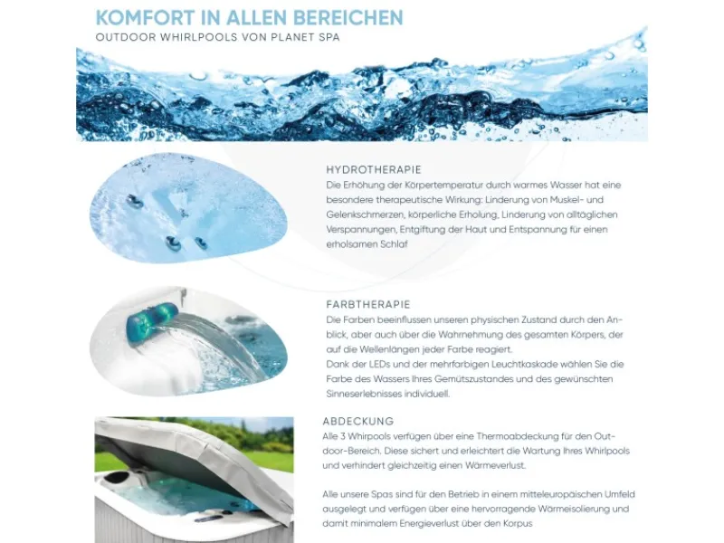 Die Planet-Spa Outdoor Whirlpools bestechen durch ihre vielseitige Einsatzmöglichkeiten. Sie sind für den Betrieb in mittel- und nordeuropäischen Klimazonen ausgelegt und können freistehend oder im Boden versenkt platziert werden.