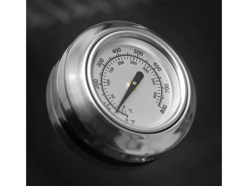Ein Thermometer, ein Flaschenöffner sowie ein Warmhalterost runden die Ausstattung des Grills ab