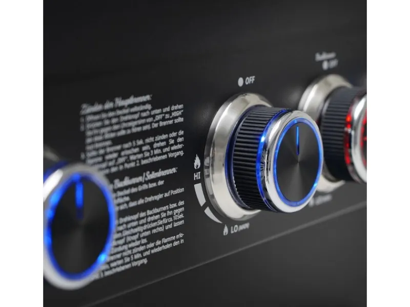 Volle Kontrolle über das Feuer und die Temperatur – Das ermöglichen die Piezozündung sowie die Drehregler inklusive Leuchtfunktion.