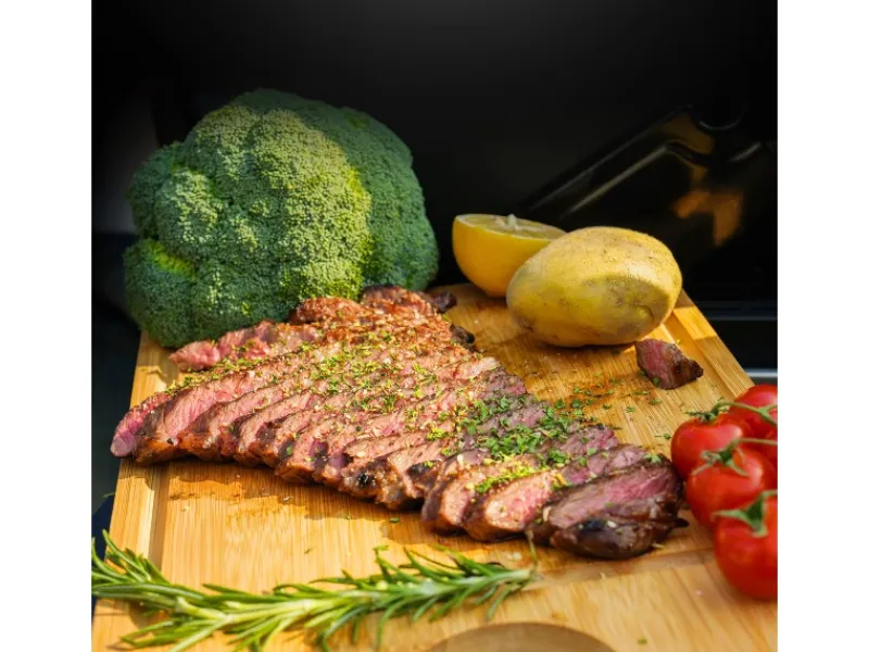 Ein Auffangbehälter mit Schneidebrett sowie ein Seitenbrenner (4 KW) ermöglichen das perfekte Steak