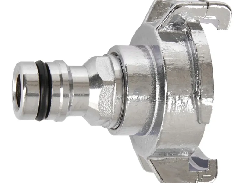 Das Geka plus-Stecksystem-Übergangsstück mit Klaue und Stecker Cr Karte. Wasserhahn mit Kupplung kann mit Schlauch mit Stecksystem angeschlossen werden.
