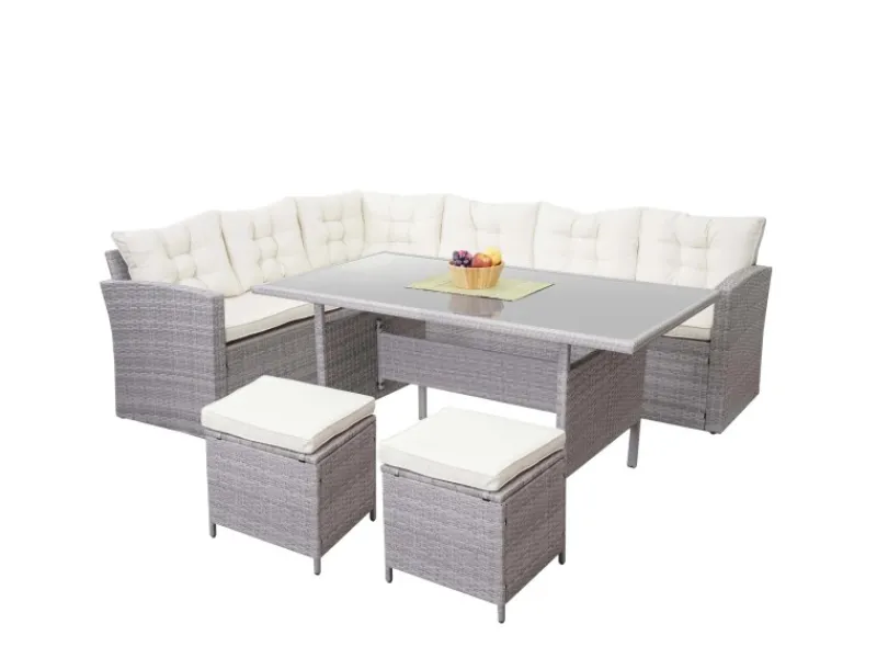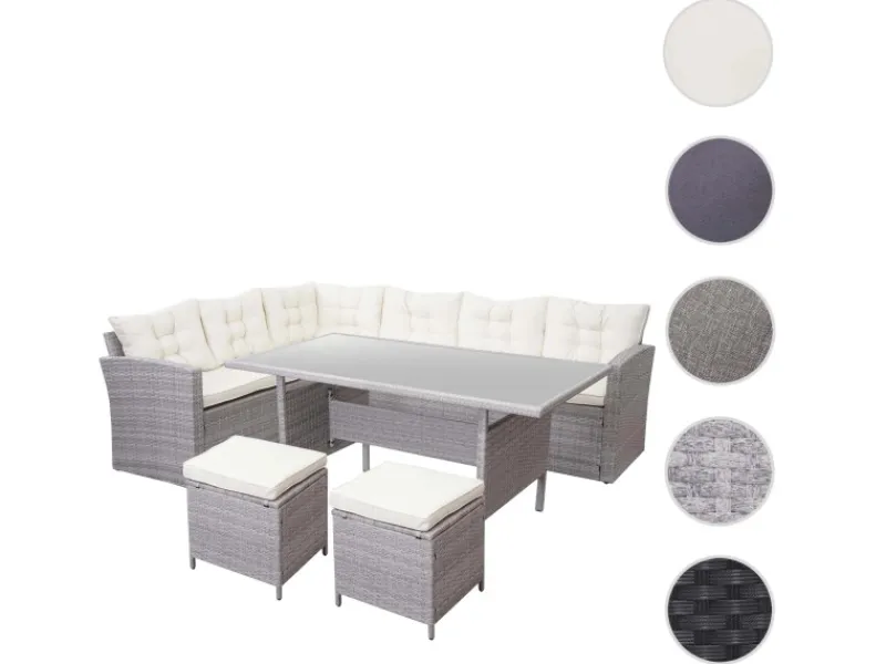 Sie sind auf der Suche nach einer Sitzgruppe, um Ihrem Garten oder Ihrer Terrasse den letzten Schliff zu verpassen? Dann haben Sie mit dieser schicken Poly-Rattan Garnitur die ideale Voraussetzung dafür. Durch ihr modernes Design wirkt sie immer einladend – sei es morgens zum Frühstück oder nachmittags zu einer gemütlichen Tasse Kaffee. Getränke, Sonnencreme oder kleine Snacks können einfach auf dem Tisch abgelegt werden. Die bequeme Polsterung sorgt für ein gemütliches Sitzgefühl für Sie und Ihre Gäste. So wird diese Garnitur ganz bestimmt zu Ihrem neuen Lieblingsplatz.