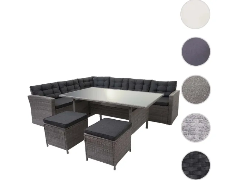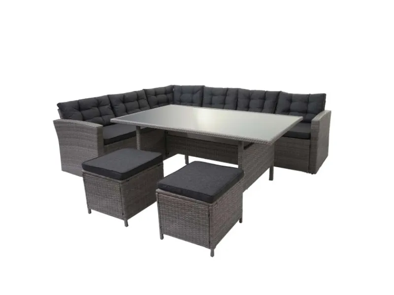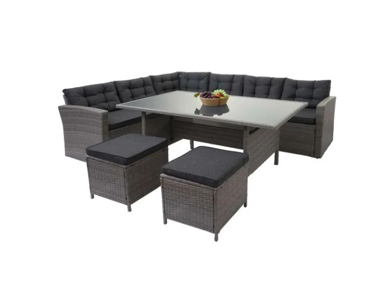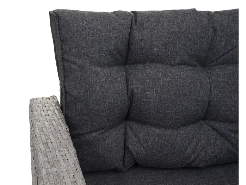 Sie sind auf der Suche nach einer Sitzgruppe, um Ihrem Garten oder Ihrer Terrasse den letzten Schliff zu verpassen? Dann haben Sie mit dieser schicken Poly-Rattan Garnitur die ideale Voraussetzung dafür. Durch ihr modernes Design wirkt sie immer einladend – sei es morgens zum Frühstück oder nachmittags zu einer gemütlichen Tasse Kaffee. Getränke, Sonnencreme oder kleine Snacks können einfach auf dem Tisch abgelegt werden. Die bequeme Polsterung sorgt für ein gemütliches Sitzgefühl für Sie und Ihre Gäste. So wird diese Garnitur ganz bestimmt zu Ihrem neuen Lieblingsplatz.