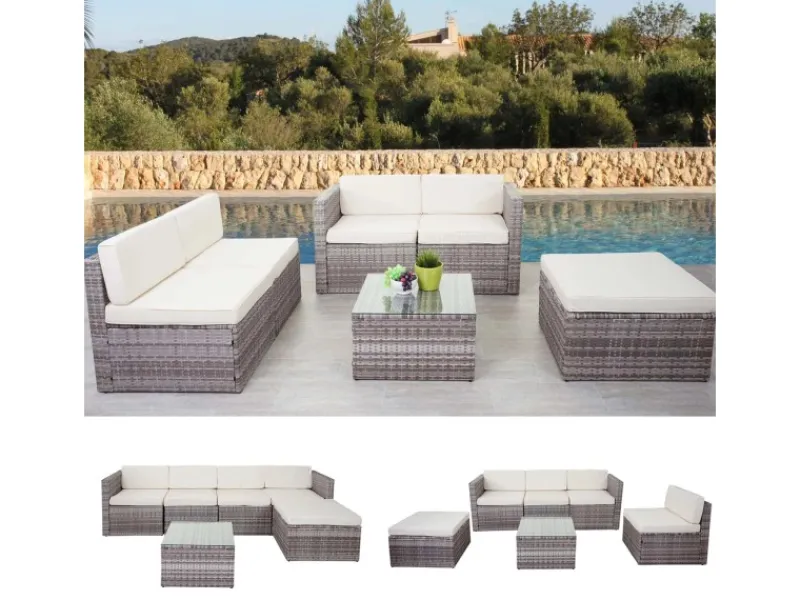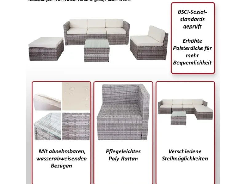 Diese Garnitur macht sich hervorragend in verschiedenen Einsatzbereichen: Sei es im Garten oder Wintergarten, Wellness- oder Lounge-Bereich, sie sieht immer so aus, als ob sie genau dort hingehört. Auch die Funktionalität lässt bei diesem gut verarbeiteten Produkt keine Wünsche offen. Die einzelnen Elemente lassen sich individuell kombinieren, somit kann man die Garnitur ganz nach Bedarf an die Gelegenheit und das Platzangebot anpassen.