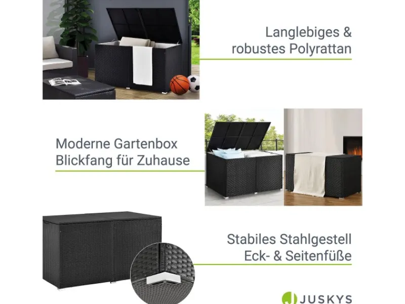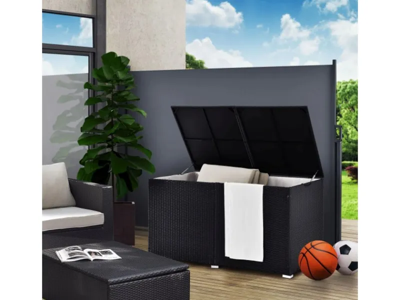 Die Aufbewahrungsbox besticht im edlen Rattan-Design. Dieses Material ist schmutzabweisend und UV-beständig. Somit ideal für den Außenbereich geeignet. Der stylische Organizer ist zudem pflegeleicht und langlebig. Durch die kompakte Form (groß, eckig) ist die Gartenbox platzsparend.