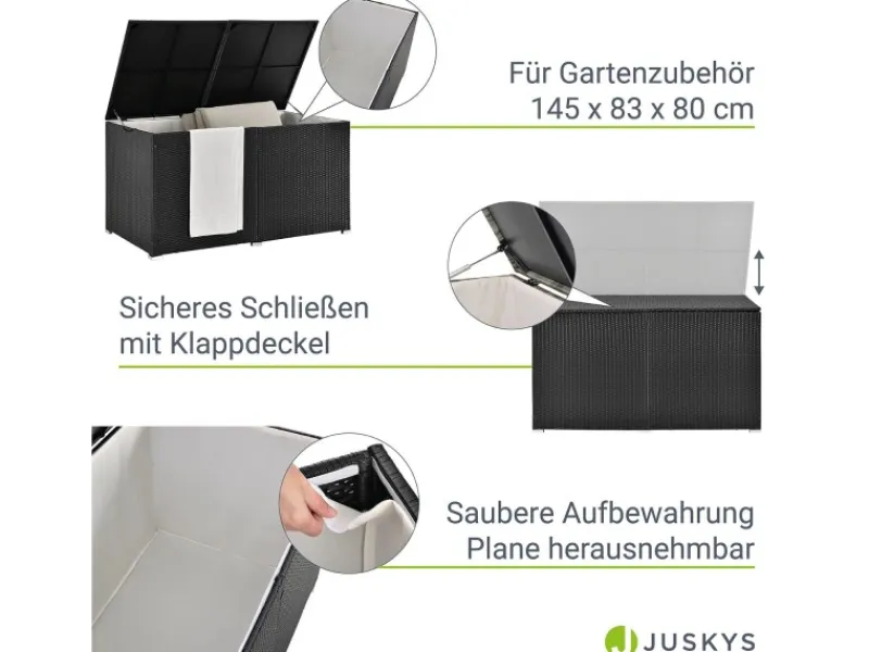 Die XXL-Auflagenbox besitzt eine Innenverkleidung. Sie dient dazu, wertvolle Gartenpolster, Sitzkissen und Garten-Deko ordentlich und schmutzfrei zu verstauen. Die Innenplane ist leicht per Klettverschluss herausnehmbar.