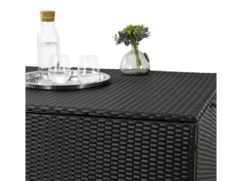 Die hochwertig verarbeitete Auflagenbox (geflochten) ist ein echtes Highlight. Ihre schlichte Rattan-Optik ist sehr beliebt. Entweder im Garten, auf dem Balkon oder drinnen. Die Kissentruhe sieht sehr edel und modern aus. Auf dem verstärkten Deckel finden leichte Gegenstände wie Deko einen Platz.