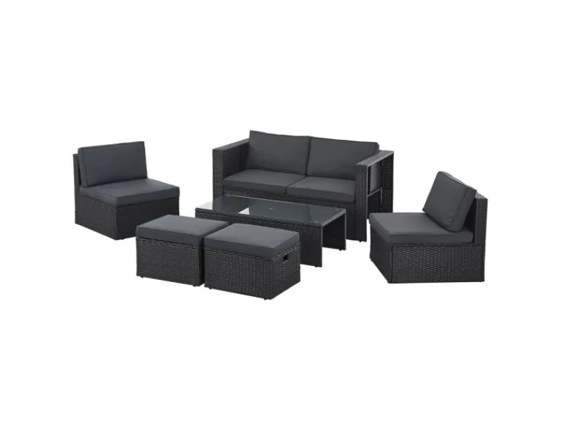 Das Polyrattan-Gewebe der Sitzgruppe ist robust und wetterbeständig, ideal für den Einsatz im Außenbereich. Die Bezüge sind abnehmbar und waschbar.