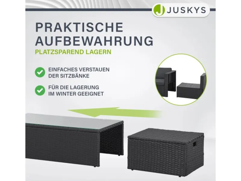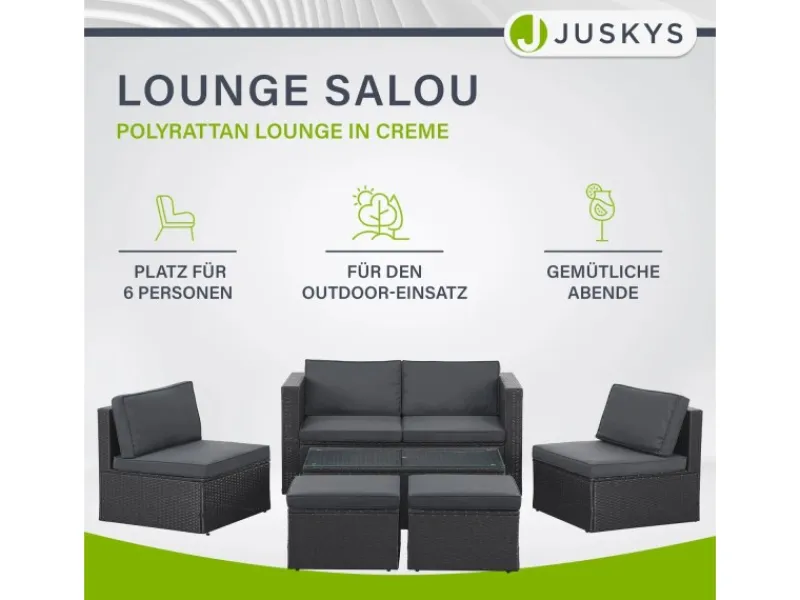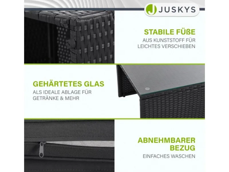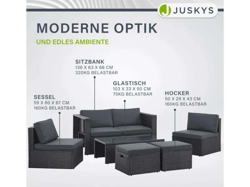 – Max. Belastbarkeit: Bank 320 kg; Sessel/Hocker je 160 kg; Tisch 75 kg