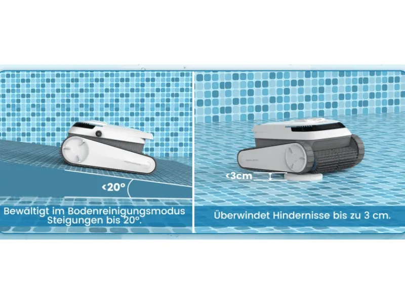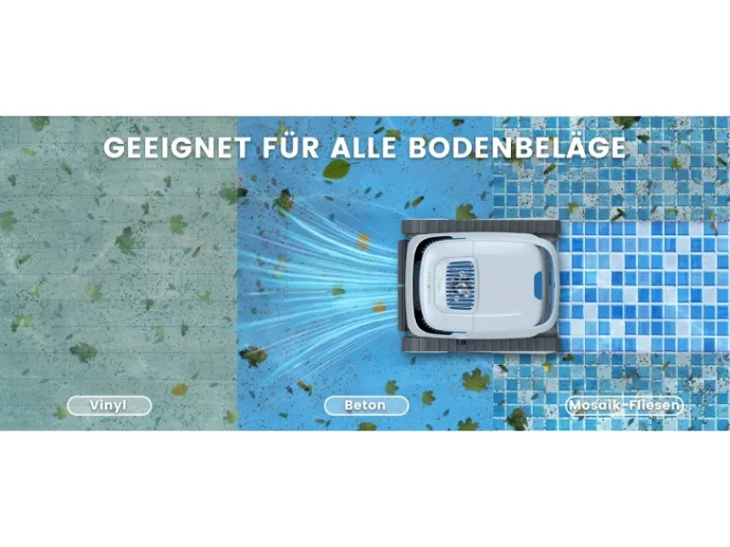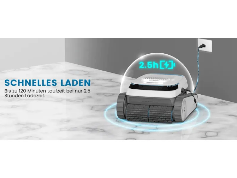 Dank des Akkus kann der Poolreiniger ca. 2h am Stück reinigen und eine Fläche von ca. 100m² abdecken