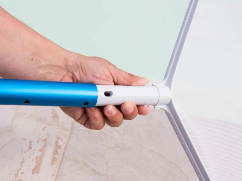 Der Bodenkescher kann schnell und einfach auf einer handelsüblichen Teleskopstange montiert bzw. demontiert werden. Dadurch wird Ihnen ein Einfaches und schnelles Arbeiten ermöglicht.