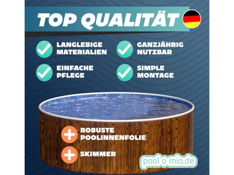 Der Stahlwandpool Ø 360 x 90 cm in edler Holzoptik ist die ideale Lösung für stilvollen Badespaß im eigenen Garten. Das Komplettset eignet sich sowohl zum freistehenden Aufstellen als auch für teilversenkte oder komplett eingelassene Einbauvarianten. Die ansprechende Holzoptik sorgt für ein harmonisches Gesamtbild in jeder Außenanlage.