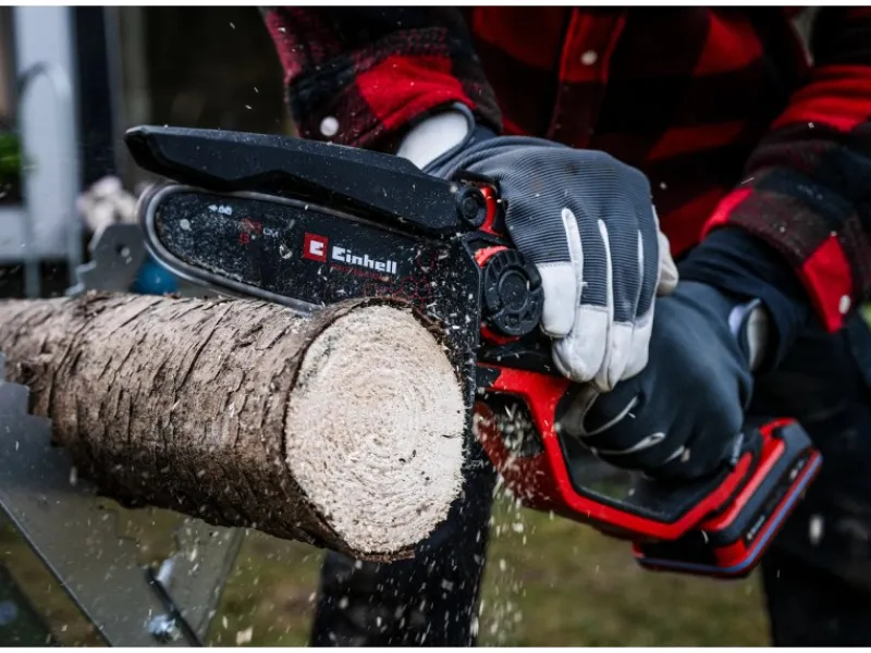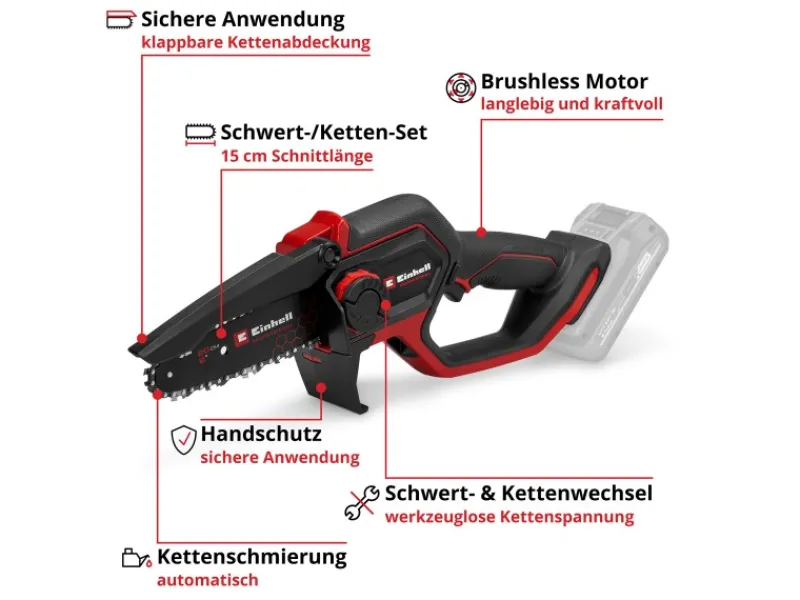 Wartungsarbeiten wie der Wechsel von Schwert und Kette und auch die Kettenspannung sind dank werkzeugloser Bedienung über einen Drehschalter besonders einfach. Für Sicherheit und Flexibilität sorgen ein integrierter Handschutz sowie eine klappbare Kettenabdeckung. Das ergonomische Design mit schlankem Griff, Softgrip-Flächen und einer Handablagefläche für beidhändige Nutzung sorgt für hohen Komfort.