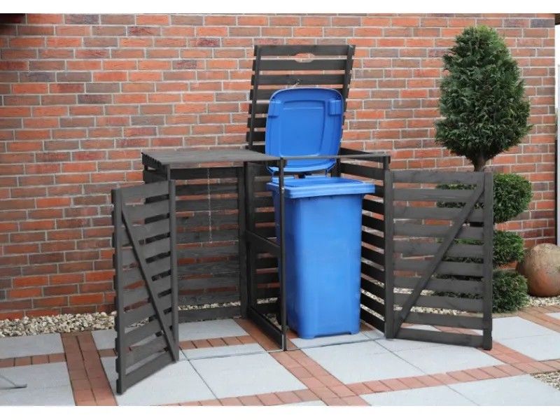Diese formschöne, stabile, aus massivem Kiefernholz gefertigte Mülltonnenbox Vario V für 2 Tonnen lässt unansehnliche Mülltonnen einfach verschwinden. Passend für alle Tonnen bis 240 Liter. Die praktische Klappe ist mit einer Kette ausgestattet, damit man mit einer Hand beim Öffnen der Müllbox gleichzeitig auch die Mülltonne öffnen kann. Die Stahlschiene am Boden verleiht der Box zusätzliche Stabilität. Die Rückwand ist verkleidet, so dass die Box auch frei aufgestellt werden kann. Mittels eines als Zubehör zu erwerbenden Erweiterungssets kann diese 2er-Box beliebig erweitert werden. Die Box ist bereits werkseitig Anthrazit imprägniert. Maße (H x B x T): 122 cm x 148 cm x 92 cm