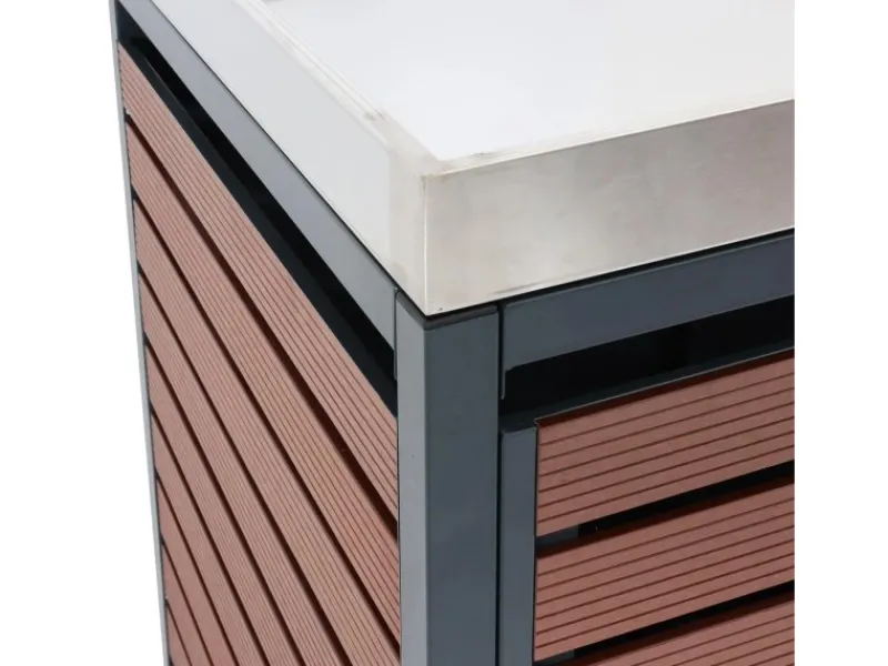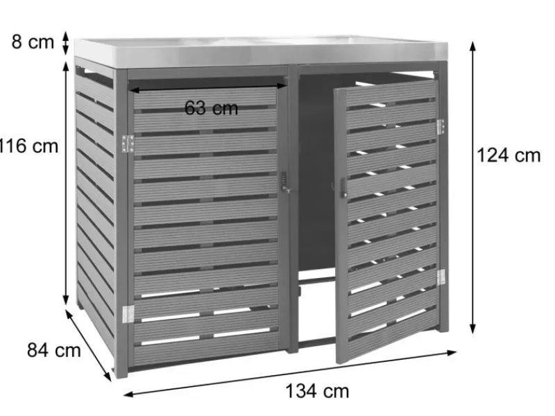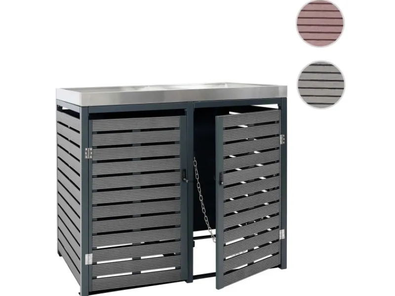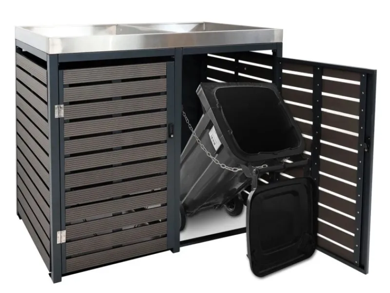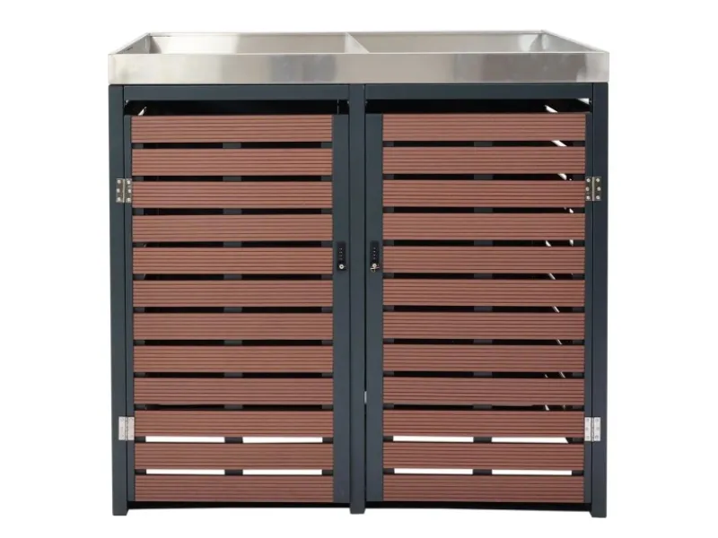Die Kombination aus WPC-Paneelen und verzinktem Stahlrahmen sorgt für eine besonders langlebige und wartungsarme Konstruktion. Durch das klare, moderne Design fügt sich die Verkleidung harmonisch in jeden Außenbereich ein – ob Garten, Terrasse oder Einfahrt. Der Deckel lässt sich bequem öffnen, während die abschließbaren Türen für Sicherheit und Ordnung sorgen. Dank der Belüftungsschlitze bleibt das Innere stets gut durchlüftet. Eine stabile, pflegeleichte und optisch ansprechende Lösung, um Ihre Mülltonnen elegant zu verbergen und den Außenbereich aufzuwerten.
