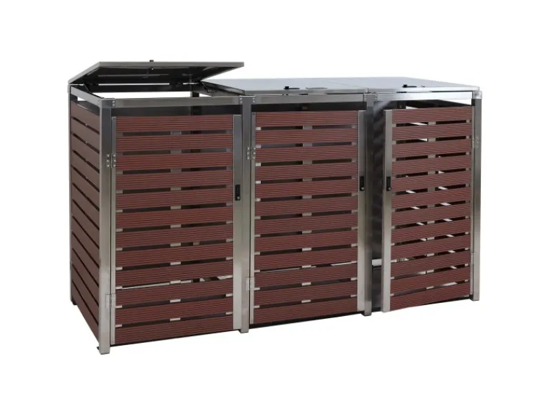 Die Kombination aus WPC-Paneelen und verzinktem Stahlrahmen sorgt für eine besonders langlebige und wartungsarme Konstruktion. Durch das klare, moderne Design fügt sich die Verkleidung harmonisch in jeden Außenbereich ein – ob Garten, Terrasse oder Einfahrt. Der Deckel lässt sich bequem öffnen, während die abschließbaren Türen für Sicherheit und Ordnung sorgen. Dank der Belüftungsschlitze bleibt das Innere stets gut durchlüftet. Eine stabile, pflegeleichte und optisch ansprechende Lösung, um Ihre Mülltonnen elegant zu verbergen und den Außenbereich aufzuwerten.