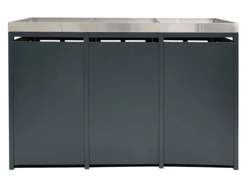 Die Kombination aus WPC-Paneelen und verzinktem Stahlrahmen sorgt für eine besonders langlebige und wartungsarme Konstruktion. Durch das klare, moderne Design fügt sich die Verkleidung harmonisch in jeden Außenbereich ein – ob Garten, Terrasse oder Einfahrt. Der Deckel lässt sich bequem öffnen, während die abschließbaren Türen für Sicherheit und Ordnung sorgen. Dank der Belüftungsschlitze bleibt das Innere stets gut durchlüftet. Eine stabile, pflegeleichte und optisch ansprechende Lösung, um Ihre Mülltonnen elegant zu verbergen und den Außenbereich aufzuwerten.