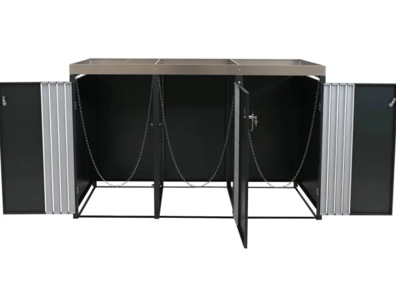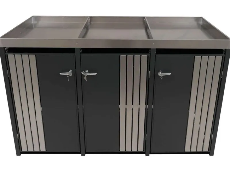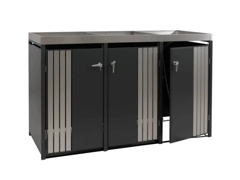 Dank der robusten Bauweise aus verzinktem Stahl überzeugt die Mülltonnenverkleidung durch ihre Wetterbeständigkeit und lange Lebensdauer. Die abschließbaren Türen schützen den Inhalt zuverlässig, während Belüftungsschlitze eine optimale Luftzirkulation gewährleisten. Durch das klare, moderne Design fügt sich die Verkleidung harmonisch in jede Umgebung ein – ob im Garten, an der Hauswand oder in der Einfahrt. Eine praktische und zugleich ästhetische Lösung, um Ordnung und Stil im Außenbereich zu schaffen.