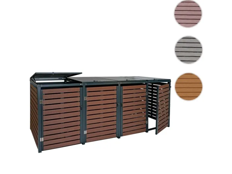 Die Kombination aus WPC-Paneelen und verzinktem Stahlrahmen sorgt für eine besonders langlebige und wartungsarme Konstruktion. Durch das klare, moderne Design fügt sich die Verkleidung harmonisch in jeden Außenbereich ein – ob Garten, Terrasse oder Einfahrt. Der Deckel lässt sich bequem öffnen, während die abschließbaren Türen für Sicherheit und Ordnung sorgen. Dank der Belüftungsschlitze bleibt das Innere stets gut durchlüftet. Eine stabile, pflegeleichte und optisch ansprechende Lösung, um Ihre Mülltonnen elegant zu verbergen und den Außenbereich aufzuwerten.