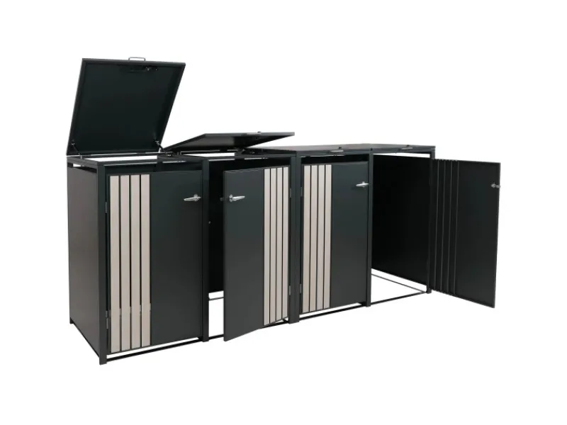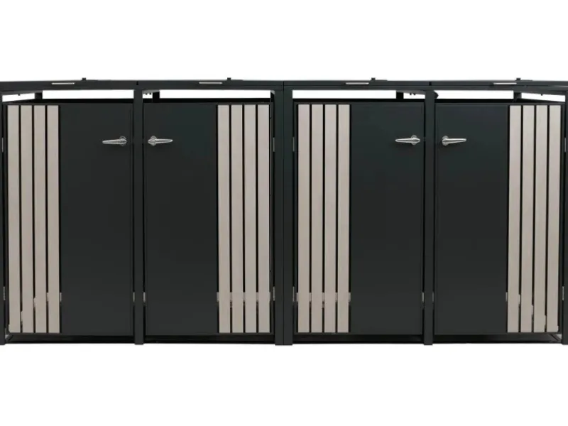 Dank der robusten Bauweise aus verzinktem Stahl überzeugt die Mülltonnenverkleidung durch ihre Wetterbeständigkeit und lange Lebensdauer. Die abschließbaren Türen schützen den Inhalt zuverlässig, während Belüftungsschlitze eine optimale Luftzirkulation gewährleisten. Durch das klare, moderne Design fügt sich die Verkleidung harmonisch in jede Umgebung ein – ob im Garten, an der Hauswand oder in der Einfahrt. Eine praktische und zugleich ästhetische Lösung, um Ordnung und Stil im Außenbereich zu schaffen.