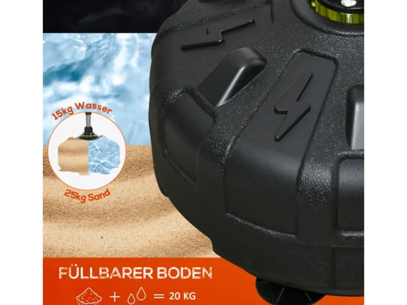 ● Die Basis kann mit 15 kg Wasser, 25 kg Sand oder einer Mischung aus beidem befüllt werden