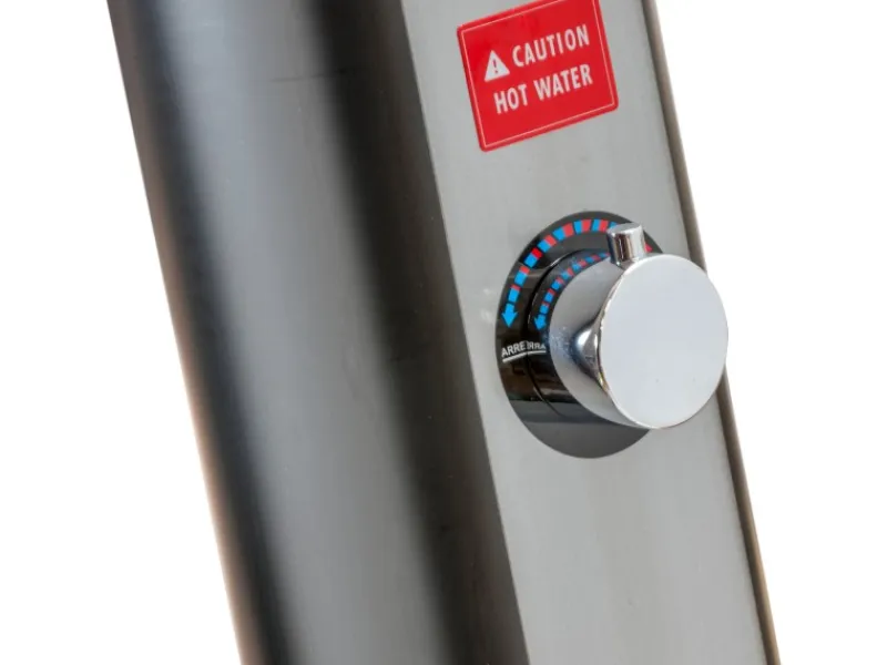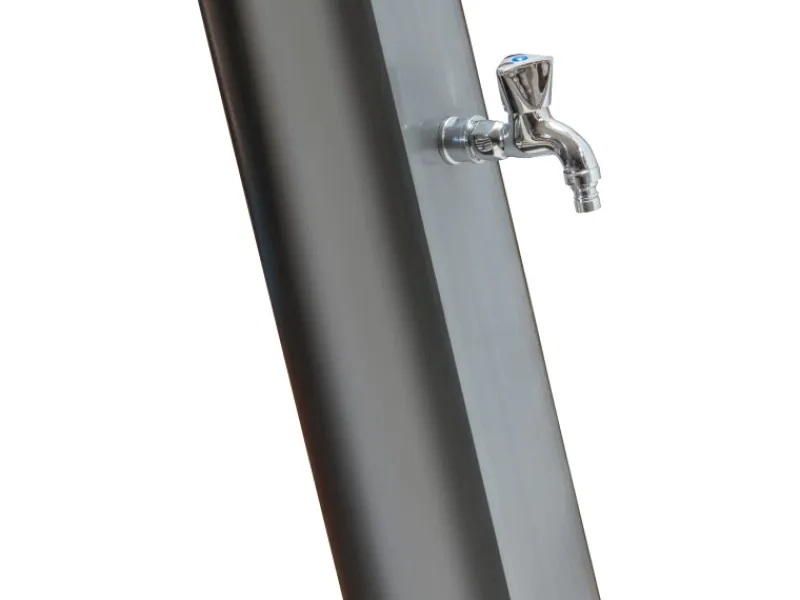 Die Gre PVC-Solardusche aus PVC ist in Schwarz gehalten. Sie verfügt über eine Einhebelarmatur aus Stahl 2VA für kaltes und warmes Wasser und einen Fußwaschhahn. Der große Regenwahldduschkopf sorgt für ein angenehmes Duscherlebnis und die Dusche hat ein Fassungsvermögen von 35 l. Durch das solarbetriebene Warmwasser ist die Dusche sehr energiesparend. Sie eignet sich beispielsweise als Gartendusche zur Aufstellung am Pool.