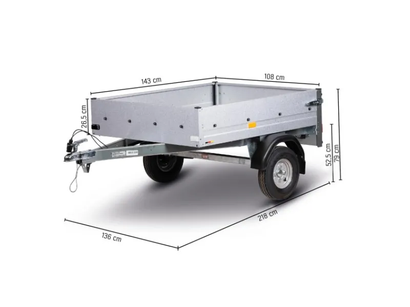 Die Ladefläche mit einer Länge von 1,34 m und einer Breite von 1,08 m eignet sich ideal für den privaten Gebrauch. Eine Zuladung ist bis maximal 270 kg möglich. Dank dieser kompakten Abmessungen können Sie den Anhänger auch platzsparend hochkant beispielweise in der Garage oder im Geräteschuppen verstauen. Die Rückwand ist mit Spannverschlüssen versehen, und lässt sich zum einfachen Beladen herunterklappen. An den Seiten sind Einhängeknöpfe vorhanden, sodass Sie optional auch eine Plane oder ein Sicherungsnetz (separat erhältlich) anbringen können.