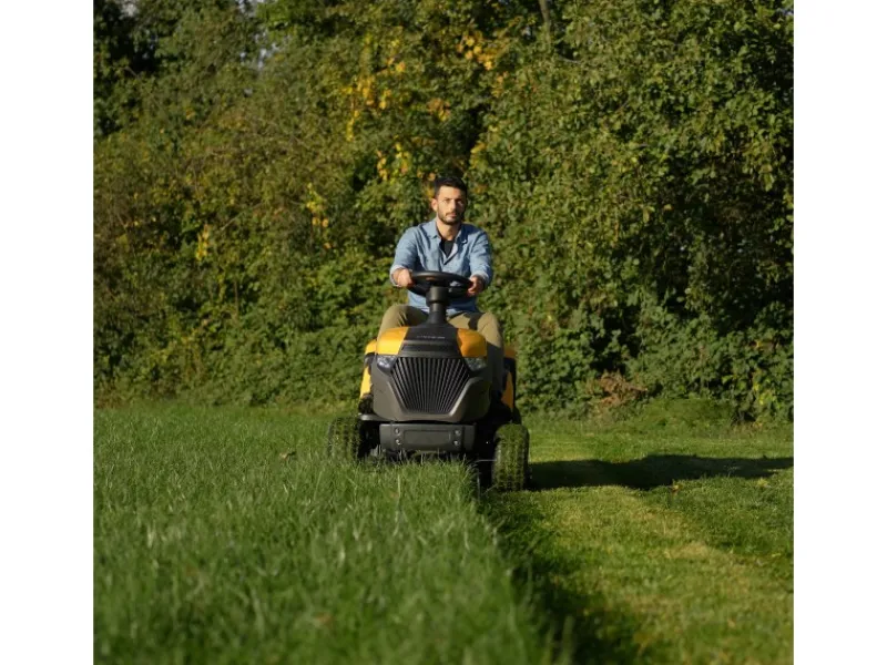 Der Rasenmähertraktor wird mit dem neuen Stiga ST 550 Twin Zweizylindermotor mit 10,4 kW (14 PS) betrieben. Dieser läuft mit reduzierter Betriebstemperatur und sparsamen Kraftstoffverbrauch sowie reduzierten Emissionen und verlängert zudem auch die Lebensdauer. Der Hubraum beträgt 576 cm³ und das Tankvolumen liegt bei 6 l. Die Geschwindigkeit im Vor- und Rückwärtsgang regelst du bequem und stufenlos über den Druck auf das Pedal. So kannst du den Rasenmähertrecker gut manövrieren und auch gekonnt um Bäume, Spielgeräte oder Gartenmöbel steuern.