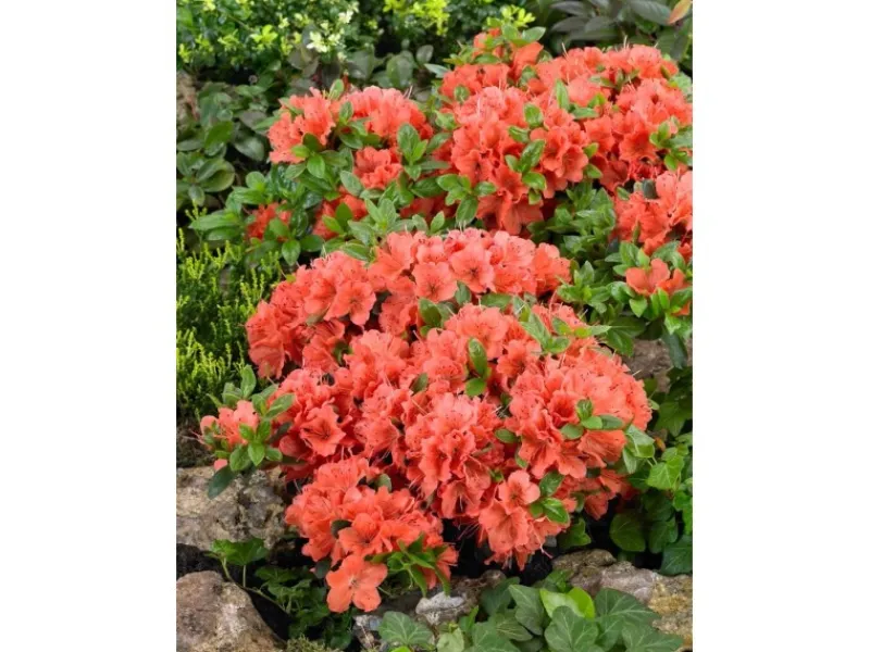 Der Rhododendron Obt. Geisha Orange wächst buschig und erreicht eine Höhe von 25–30 cm.