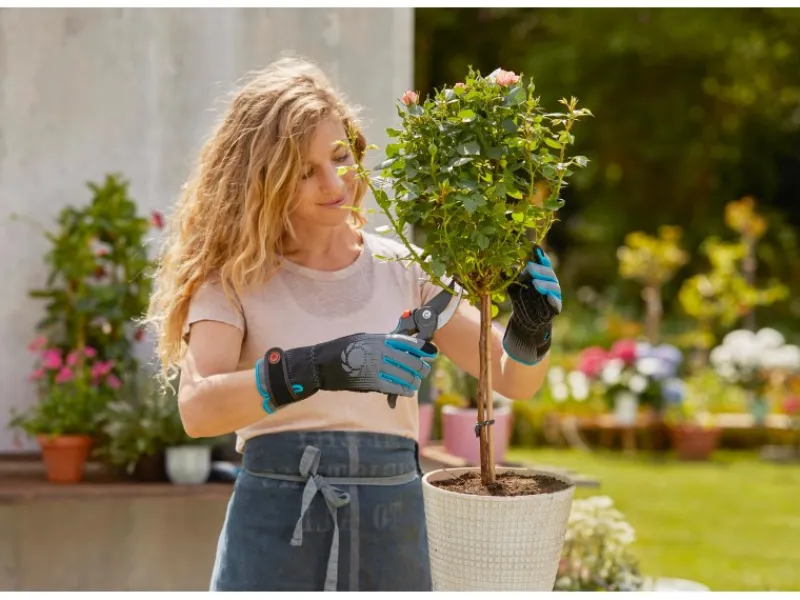 Der Gardena Rosenhandschuh L ist ideal für Schneidarbeiten und Arbeiten mit Rosen sowie dornigen Sträuchern. Er ist aus besonders durchstichfestem Aramid Material gearbeitet. An den Innenflächen und Fingern wurden robuste und schützende Materialien verwendet. Der Rosenhandschuh schützt mit einem extra langen Schaft die Handgelenke zuverlässig beim Schneiden und Pflegen von Rosen. Durch das spezielle Design der Fingerkuppen an Daumen und Zeigefinger läßt sich ein Smartphone problemlos bedienen, ohne die Handschuhe auszuziehen.