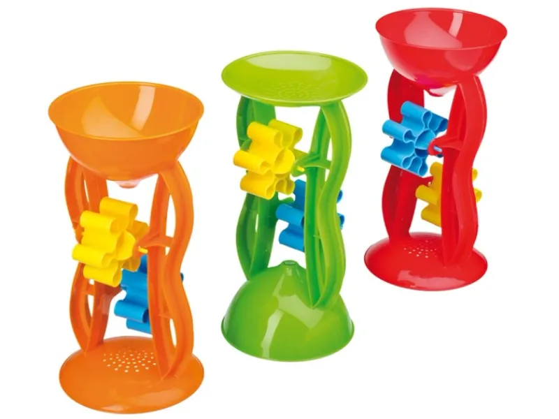 Die Sandspielzeuge sind bunt sortiert in den Farben Orange, Grün und Rot.