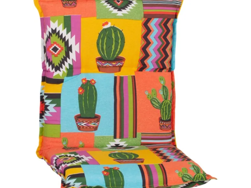Saumauflage für Hochlehner Gartenstühle mit den Maßen 118 cm x 46 cm und einer Polsterstärke von 8 cm. Die Auflage hat eine Schaumstoff- und Vliesfüllung. Der Stoff besteht aus 75% Baumwolle und 25% Polyester. Er ist schadstoffrei.