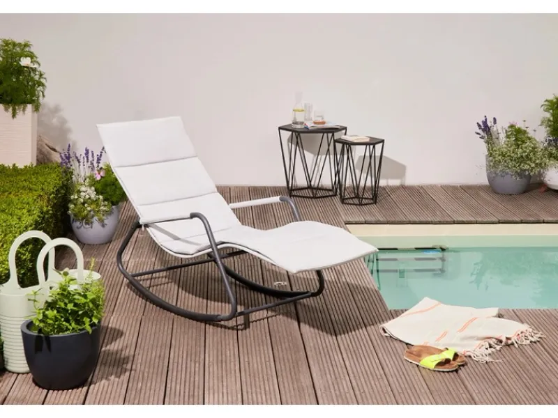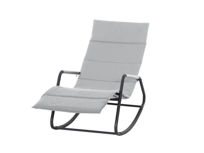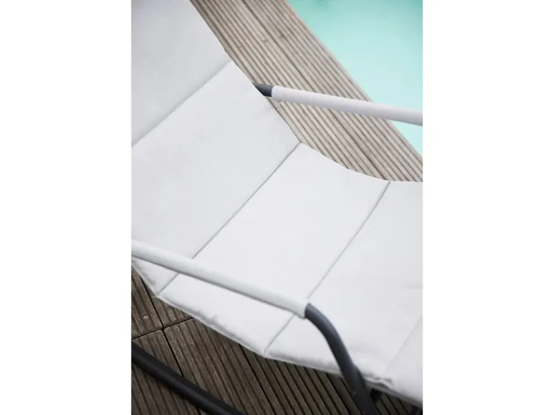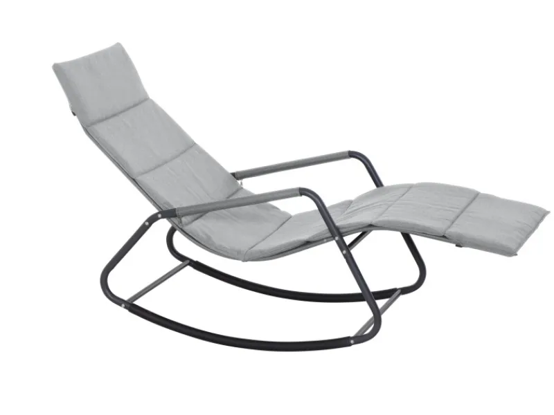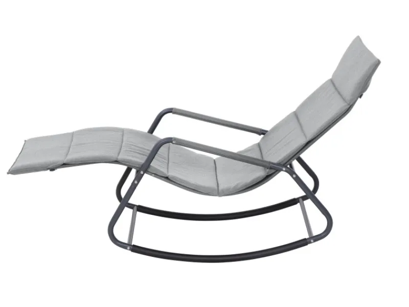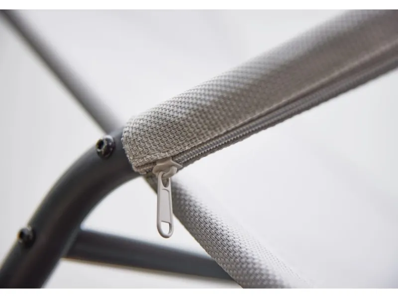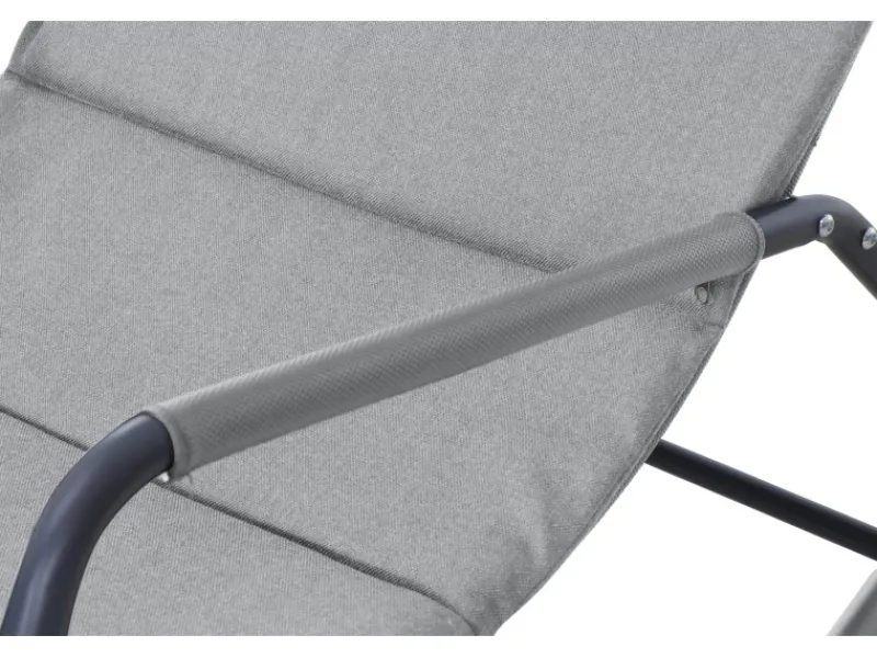 Das Gestell der Schaukelliege besteht aus pulverbeschichtetem Stahl in Matt-Anthrazit, was für Stabilität und Langlebigkeit sorgt. Die Liege- und Armflächen sind aus hochwertigem Ranotex-Gewebe gefertigt, das nicht nur strapazierfähig ist, sondern auch einen modernen und leichten Look verleiht.
