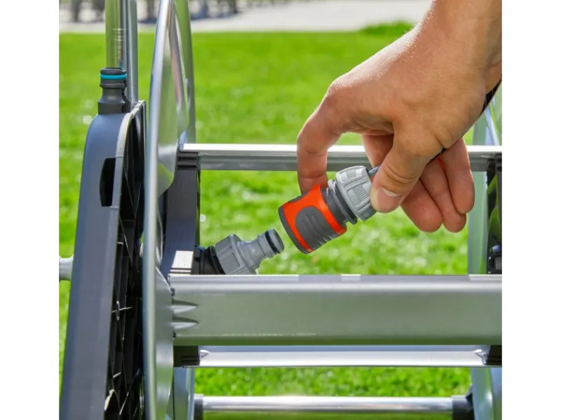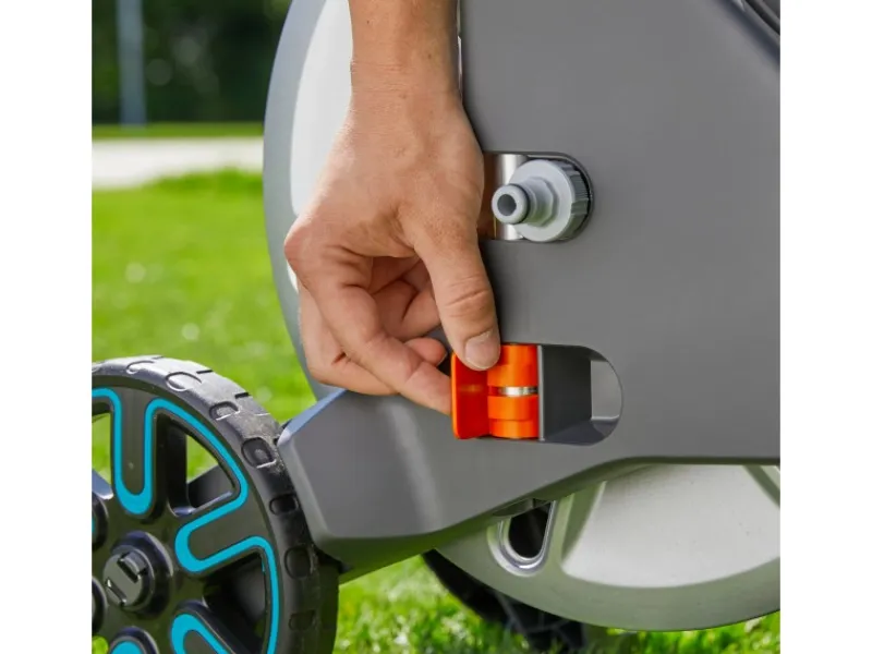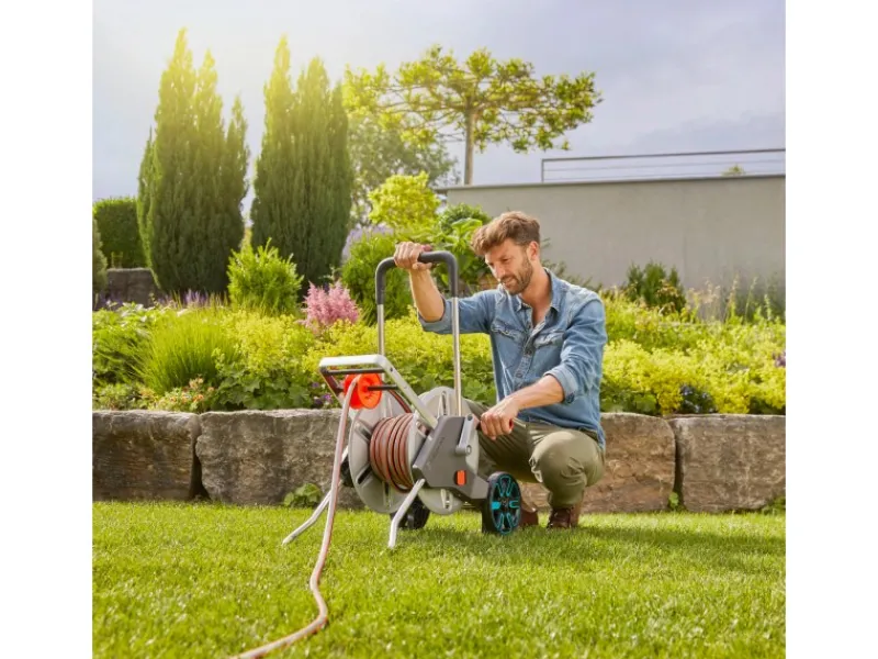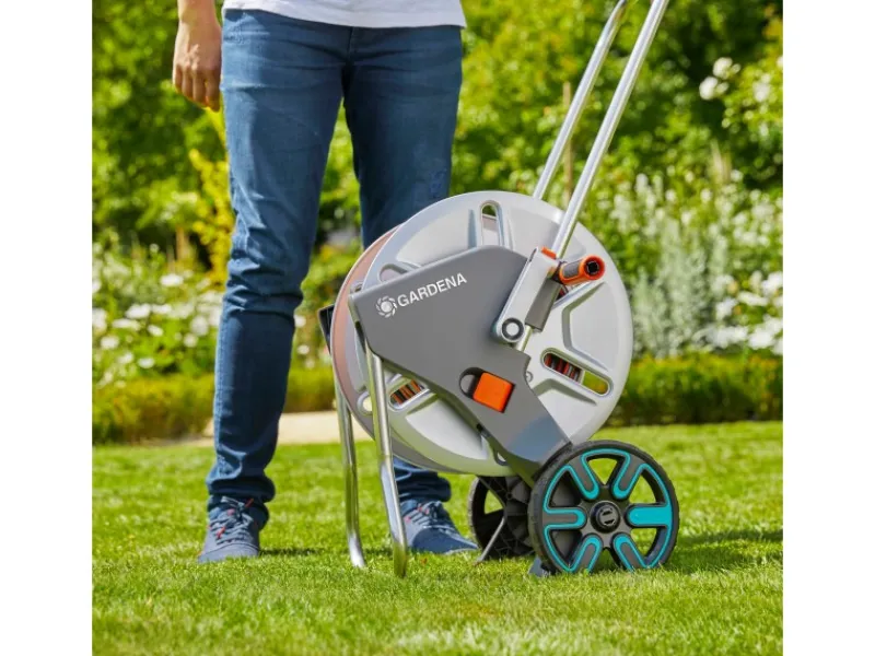 Der Standfuß mit Kick & Stand Technologie gewährleistet hohe Standsicherheit. Wird der Schlauchwagen einmal nicht verwendet oder soll transportiert werden, können Standfuß sowie Griff und Kurbel einfach eingeklappt werden. So lässt sich dieser platzsparender verstauen. Der Nachtropfstopp sorgt darüber hinaus dafür, dass beim Transport kein Wasser ausläuft. Über die leichtläufigen Räder kann der Schlauchwagen bequem bewegt werden.