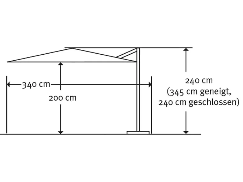 Aufgespannt hat der Gartenschirm eine Größe von 270 cm in der Breite und 270 cm in der Tiefe. Die maximale Höhe des Sonnenschirms beträgt 240 cm und bietet dadurch eine große Schattenfläche. Dank seines seitlichen Schirmmastes geht kein Platz verloren, sodass Sie eine frei nutzbare Fläche unter dem Schirm haben. Dadurch lassen sich Sonnenliegen oder auch eine ganze Möbelgruppe zum Essen, Plaudern und Entspannen im Schatten aufstellen.