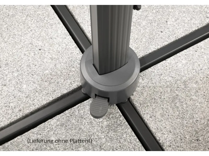 Im Lieferumfang enthalten ist ein Plattenständer für 4 Wegeplatten in der Größe 50 cm x 50 cm x 5 cm (separat erhältlich). Dieser gibt dem Schirm einen sehr stabilen Halt.