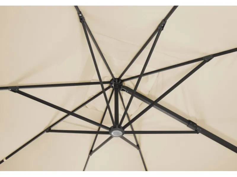 Das Aluminiumgestell ist anthrazitgrau pulverbeschichtet und passt somit optisch sehr gut zur Bespannung. Der einteilige Stock verfügt über ein massives Drehgelenk aus Gusseisen. Die Streben sind mit stabilen Strebengelenken ausgestattet. Insgesamt hat der Schirm eine sehr stabile Konstruktion. Der Handgriff mit integrierter Kurbel ermöglicht sowohl ein komfortables und leichtes Öffnen und Schließen des Schirmes, als auch eine individuelle Einstellung der Dachneigung. Durch Betätigen des Fußpedals am Drehgelenk lässt sich der Schirm zudem um 360° drehen, wodurch es Ihnen möglich ist, den Sonnenschutz ohne viel Aufwand entsprechend der Sonneneinstrahlung auszurichten.