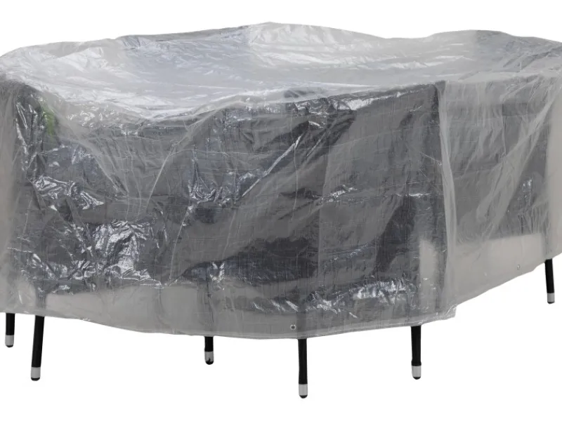 Mit dieser passgenauen Abdeckung für Sitzgruppen sind Sie auf der sicheren Seite, wenn es um Schutz vor Feuchtigkeit, Staub, Schmutz und UV Strahlen bis zu 5000 Sonnenstunden geht. Bei regelmäßigem Gebrauch schützt die Folie Ihre Sitzgruppe vor Witterungseinflüssen. Dieses transparente PE Bändchen Gewebe ist natürlich auch auf Schadstoffreiheit von einem unabhängigen Institut überprüft. Tipp : Bitte achten Sie auf mögliches Schwitzwasser, welches sich bei längerem Gebrauch bilden kann. Das abzudeckende Garten Mobiliar sollte immer etwas belüftet sein. PE Bändchengewebe. Schadstofffrei. Transparente Farbe. Schutz für 5000 Sonnenstunden. Maße: ca. 180 cm x 125 cm.
