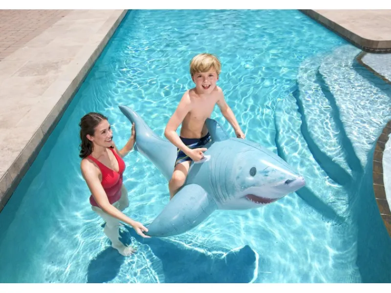 Mit einer imposanten Größe von 178 x 98 x 53 cm bietet unser aufgeblasener Hai nicht nur jede Menge Platz zum Toben, sondern auch das perfekte Maß an Sicherheit. Das Schwimmtier eignet sich ideal für Kinder ab 3 Jahren und sorgt für stundenlangen Wasserspaß. Die detailgetreue Gestaltung des Schwimmtiers lässt kleine Wasserratten glauben, sie begegnen einem echten Raubfisch – jedoch in einer sicheren Umgebung. Unsere robusten Haltegriffe bieten den kleinen Abenteurern Stabilität und Sicherheit, während sie sich auf dem Hai festhalten und sich auf dem Wasser treiben lassen. Das Aufblasen ist kinderleicht, keine langwierige Prozedur – einfach aufpusten und schon kann der Spaß beginnen. Und wenn der Tag vorbei ist, lässt sich das Schwimmtier leicht entleeren und bequem verstauen, ideal für unterwegs. Das Set enthält nicht nur das Schwimmtier, sondern auch einen Reparaturflicken, um sicherzustellen, dass der Wasserspaß nie endet.