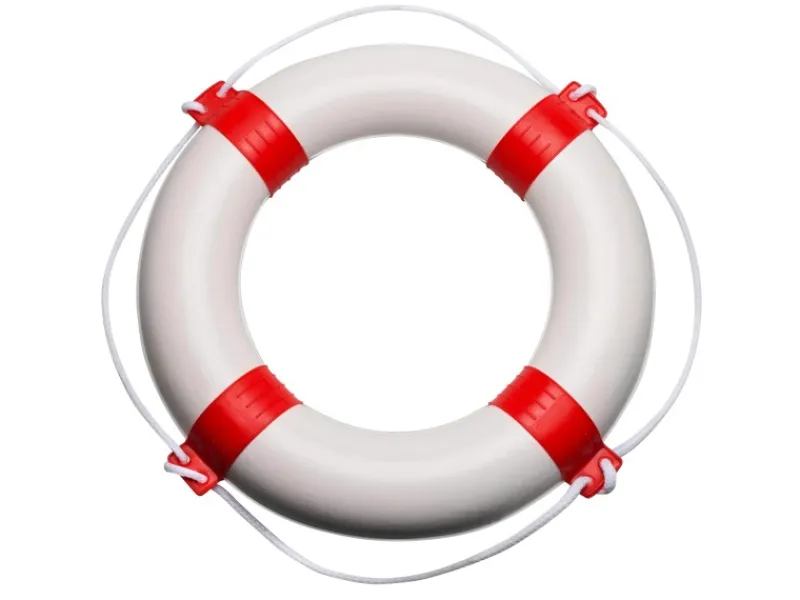 Ein Rettungsring der Firma Seilflechter mit PVC-Überzug und Randleine. Der Ring ist weiss-blau und hat einen Innen-Ø von 550 mm und einen Außen-Ø von 600 mm.
