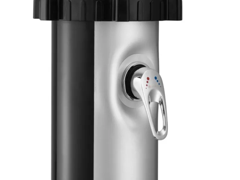 Die praktische Solardusche besticht durch ein schlichtes Design aus schwarzem PVC und silbernen Armaturen. Hierdurch fügt sich die Pooldusche nahtlos in Ihren Garten ein.