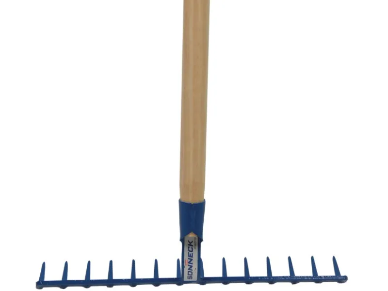 Der robuste Sonneck Bau- und Gartenrechen ist geschmiedet und gehärtet und verfügt über 14 Zähnen. Der Holzstiel ist 1400 mm lang.