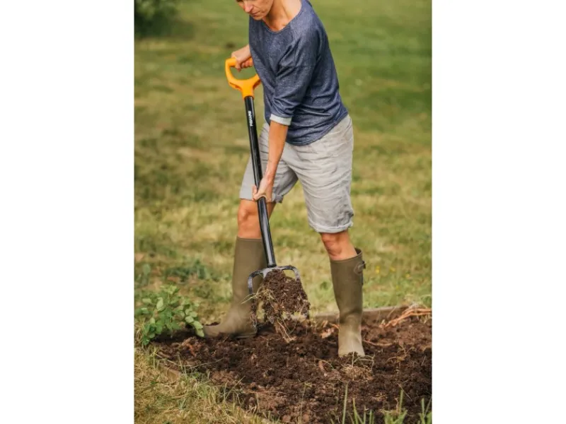 Die Fiskars Spatengabel Solid eignet sich optimal zum Wenden und Lockern von festen Böden, zum Belüften des Rasens sowie zum Herausharken von Steinen oder Unkraut. Die Zinken lassen sich problemlos, ohne viel Kraftaufwand, in den Boden drücken und werden dank ihrer Schärfe weder von Unkraut noch von Wurzeln blockiert. Sie kann ebenfalls zum Anheben, Wenden und Ausbreiten von losen Materialien, wie Gras, Heu und Kompost verwenden.