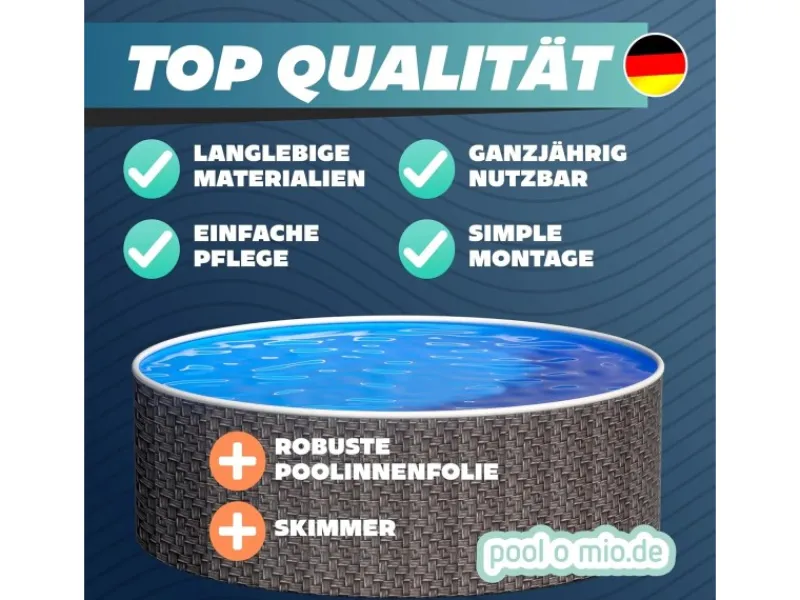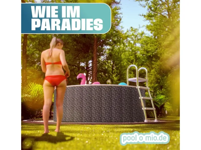 Mit dem Stahlwandpool Ø 360 x 120 cm in moderner Rattanoptik holen Sie sich ein stilvolles und robustes Komplettset in den Garten. Der Pool überzeugt durch seine flexible Aufstellung: freistehend, teilversenkt oder vollständig eingelassen – ganz nach Ihren räumlichen Möglichkeiten. Das ansprechende Rattandekor sorgt dabei für ein harmonisches Gesamtbild und macht den Pool zu einem Blickfang im Außenbereich.