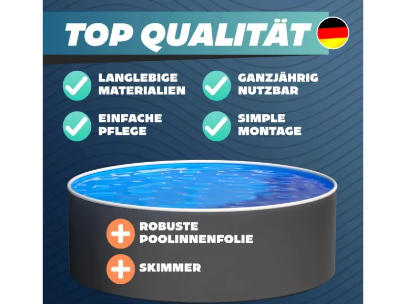 Der Stahlwandpool Ø 360 x 90 cm in Graphit/Weiß vereint stilvolles Design mit funktionaler Langlebigkeit. Seine elegante Farbgebung macht ihn zum Blickfang jeder Gartenlandschaft – ideal für Familien, Erholungssuchende und stilbewusste Poolbesitzer.