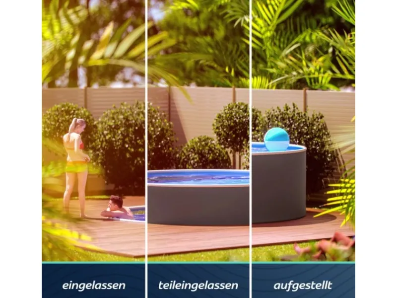 Dank der stabilen Konstruktion kann der Pool sowohl freistehend als auch teilversenkt oder vollständig eingelassen werden. Die Selbstmontage ist einfach umsetzbar und erfordert weder Betonfundamente noch aufwendige Aushubarbeiten.