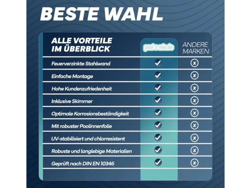 Mit dem Stahlwandpool von poolomio verwandeln Sie Ihre Terrasse oder Ihren Garten in eine persönliche Erholungsoase. Die massive Bauweise mit feuerverzinkter Stahlwand und langlebiger Poolfolie bietet Sicherheit und Komfort für die ganze Familie.