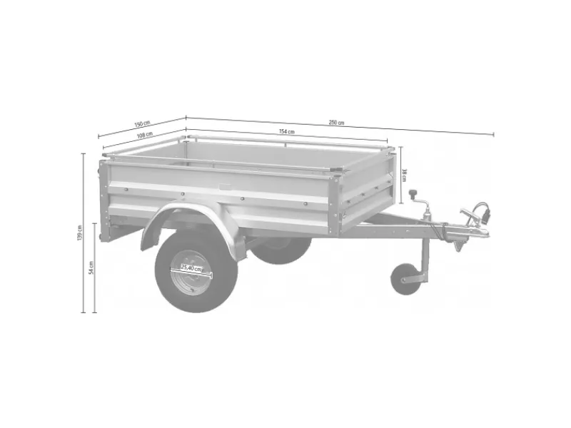 Der ungebremste, einachsige Tieflader hat ein maximal zulässiges Gesamtgewicht von 550 kg und eine Nutzlast von 440 kg.
