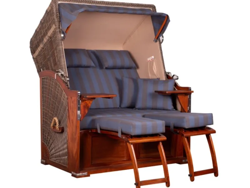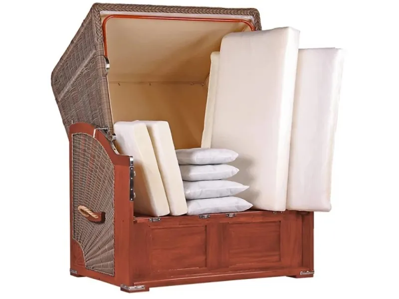 Herrliches Freizeit-Feeling mit dem Strandkorb Nordstrand Mahagoni Es muss ja nicht immer die Ost- oder Nordsee sein- auch in Ihrem eigenen Garten oder auf dem Balkon können Sie in einem unserer Strandkörbe mit Wechselpolster nach Herzenslust die Seele baumeln lassen. Die ausgesprochen exzellente und bis ins kleinste Detail ausgeführte hervorragende Verarbeitung weckt bei diesem Volllieger bereits die Lust, es sich nach der Betriebsamkeit des Alltags in diesem Strandkorb so richtig gemütlich zu machen. Auf Grund der Design- Vielfalt, die wir Ihnen bezüglich der Polsterung präsentieren, haben Sie die Möglichkeit, sich den Strandkorb Nordstrand nach Ihren ganz persönlichen Wünschen zu gestalten. So schaffen Sie sich einen unverwechselbaren und individuellen Rückzugsort mit charakteristischer Optik, der Sie auf hohem Niveau zur Entschleunigung einlädt. Hochwertiges Mahagoniholz Dass für den Strandkorb Nordstrand verwendete Mahagoniholz überzeugt durch seinen edlen, rötlich-braunen Farbton, der dem Strandkorb seinen klassischen und maritimen Charakter verleiht. Zudem sorgt das massive Mahagoniholz für Standfestigkeit und Stabiltität und macht den Strandkorb Nordstrand zu einem hochwertigen Gartenmöbel. Die Verwendung von Mahagoniholz im Außenbereich hat eine lange Tradition. Das besonders harte und damit witterungsbeständige Holz wird von jeher sowohl im Schiffsbau als auch im Gartenbereich eingesetzt. Somit eignet es sich auch für die Herstellung von Strandkörben besonders gut. Um das Mahagoniholz in seiner einzigartigen Optik zu erhalten, empfehlen wir die regelmäßige Lackierung des Holzes mit einem offenporigen PU-Lack. Diese Pflege macht den Strandkorb Nordstrand zu einem absoluten Highlight in Ihrem Garten oder auf Ihrer Terrasse. Langlebiges PE-Geflecht Die aufwendig gestaltete Flechtung des Strandkorbes wird in liebevoller Handarbeit für jeden Strandkorb einzeln erstellt. Die interessante Sonnenflechtung des Seitenteils und die akkurate Verarbeitung der Oberkorbs zeugen von hohem handwerklichem Geschick und verleihen dem Strandkorb Nordstrand sein klassisches Design. Das verwendete PE (Polyethylen)-Geflecht ist ideal für den Einsatz im Freien, denn es ist robust und temperaturbeständig, besonders auch bei hohen Temperaturschwankungen. Zudem ist die glatte Oberfläche des Geflechtes schmutz- und witterungsabweisend. Weitere Vorteile wie UV-Beständigkeit und Farbechtheit machen Ihren Strandkorb Nordstrand zu einem langjährigen Begleiter, an dem Sie lange Ihre Freude haben werden. Edelstahl und viele Extras Neben dem massiven Teakholz und beständigen PE-Geflecht verwenden wir für unseren Strandkorb Nordstrand ausschließlich hochwertige Edelstahlbeschläge aus V2A-Edelstahl. Diese Beschläge kommen bei der Befestigung der Bistrotische, der Verstärkung der unteren Ecken und beim Feststellmechanismus der Verstellgriffe zum Einsatz. Doch auch die verwendeten Schrauben, sowie die Haken zur Befestigung der abnehmbaren Fußstützen sind bewusst aus Edelstahl gewählt. Komplettiert wird der Strandkorb Nordstrand durch eine Vielzahl durchdachter Extras. Das großzügige Staufach unter der Sitzbank, die beiden Zeitungstaschen und die großen schwenkbaren Bistrotische sind praktische Details, die Ihre Auszeit im Strandkorb Nordstrand perfekt machen. Zudem sorgen extradicke Polster für einen bequemen Sitzkomfort. Der Strandkorb Nordstrand wird grundsätzlich mit farblich abgestimmten Wurf- und Nackenkissen geliefert, die sich variabel einsetzen lassen. Somit lässt der Strandkorb Nordstrand keine Wünsche offen – lassen Sie sich von unserer vielfältigen Auswahl inspirieren.